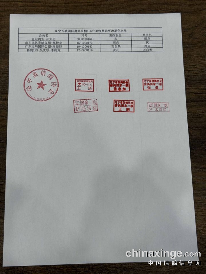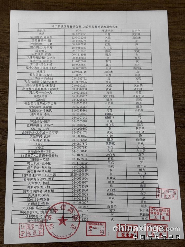 辽宁长城国际赛鸽公棚105公里收费站更改羽色名单