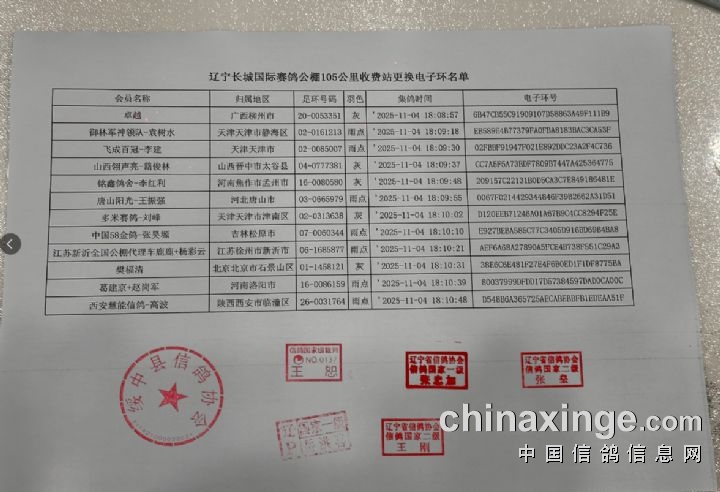 辽宁长城国际赛鸽公棚105公里收费站更改足环号码信息公告