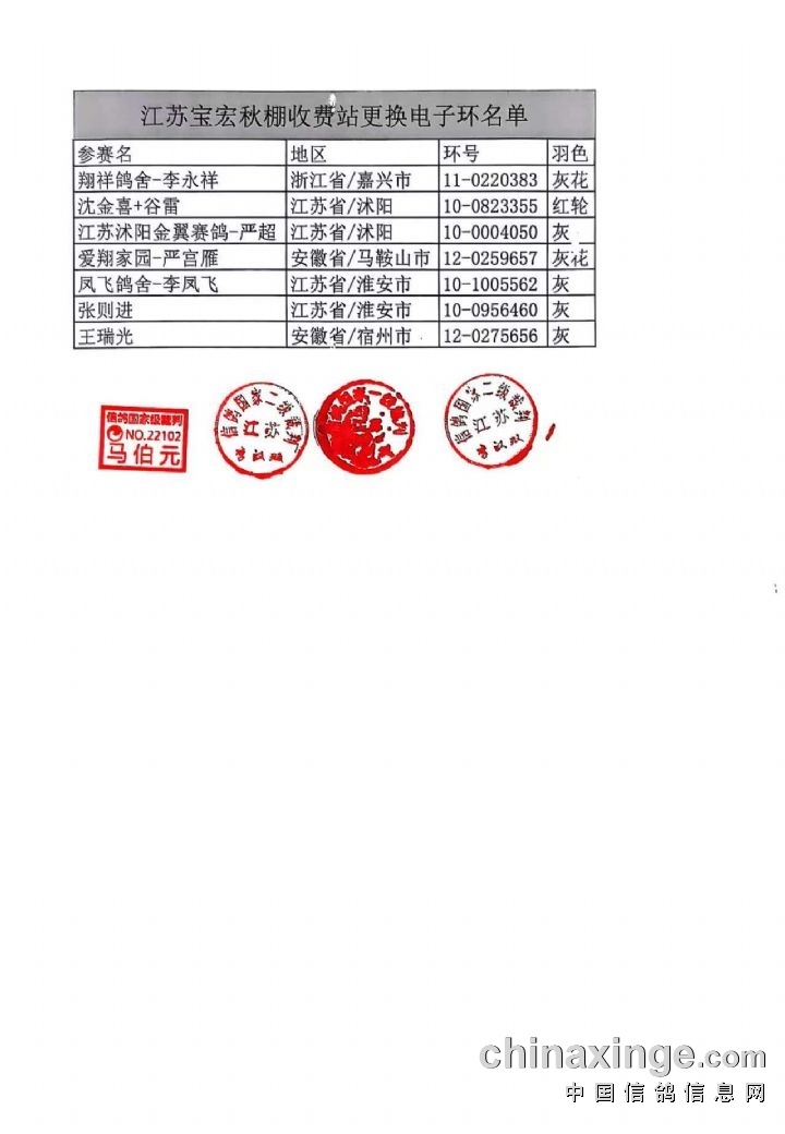 江苏宝宏秋棚收费站集鸽清单11.4(按集鸽顺序)