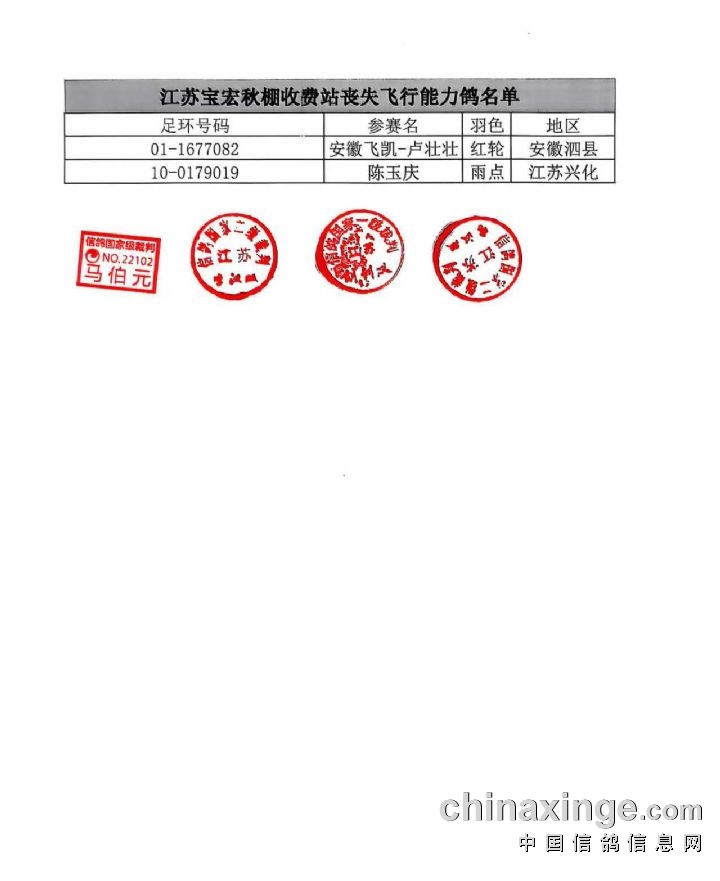 江苏宝宏秋棚收费站丧失飞行能力鸽名单