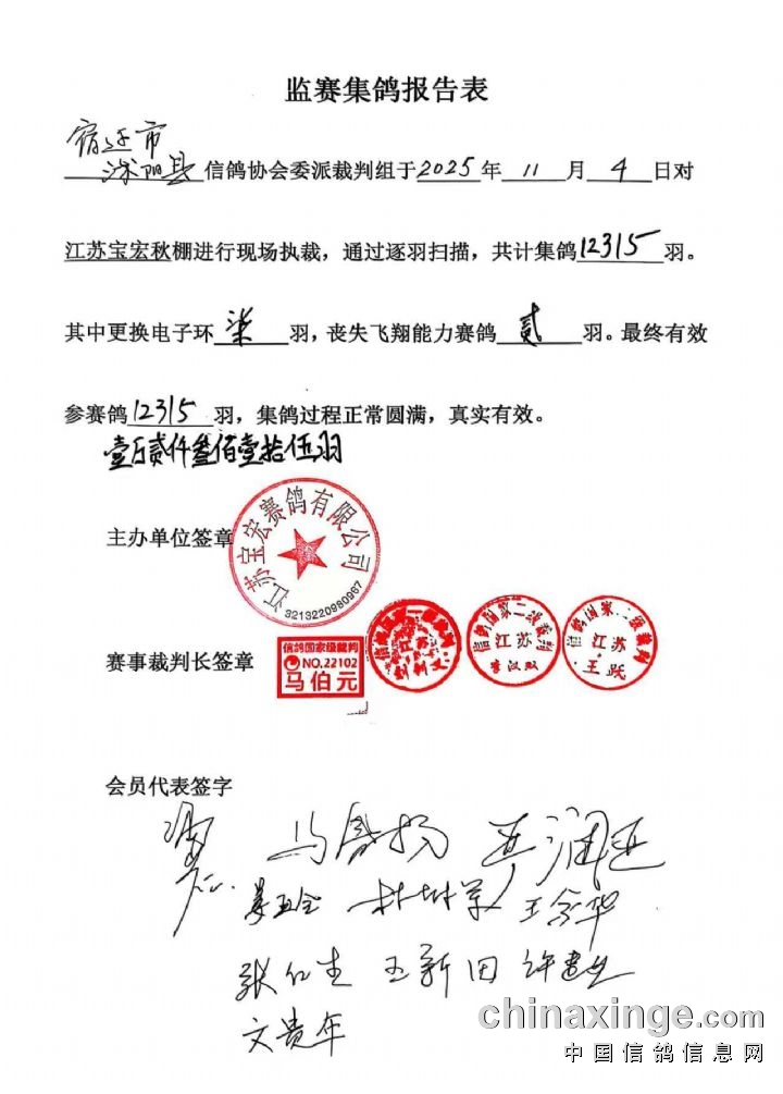 江苏宝宏秋棚收费站监赛集鸽报告表
