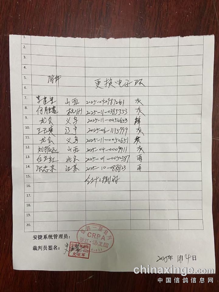 浙江盛世赛鸽公棚收费站更改足环号码清单