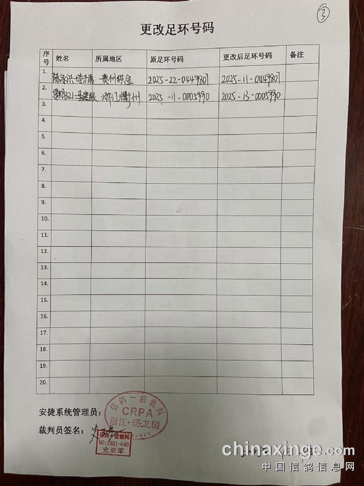 浙江盛世赛鸽公棚收费站更改足环号码清单