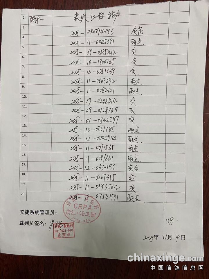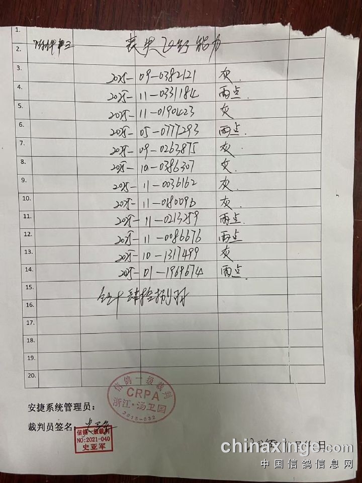浙江盛世赛鸽公棚收费站上笼清单(按上笼顺序)