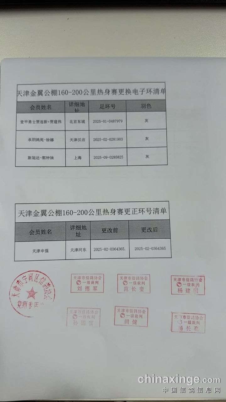 天津金翼公棚160-200公里热身赛更换电子环及更正环号清单