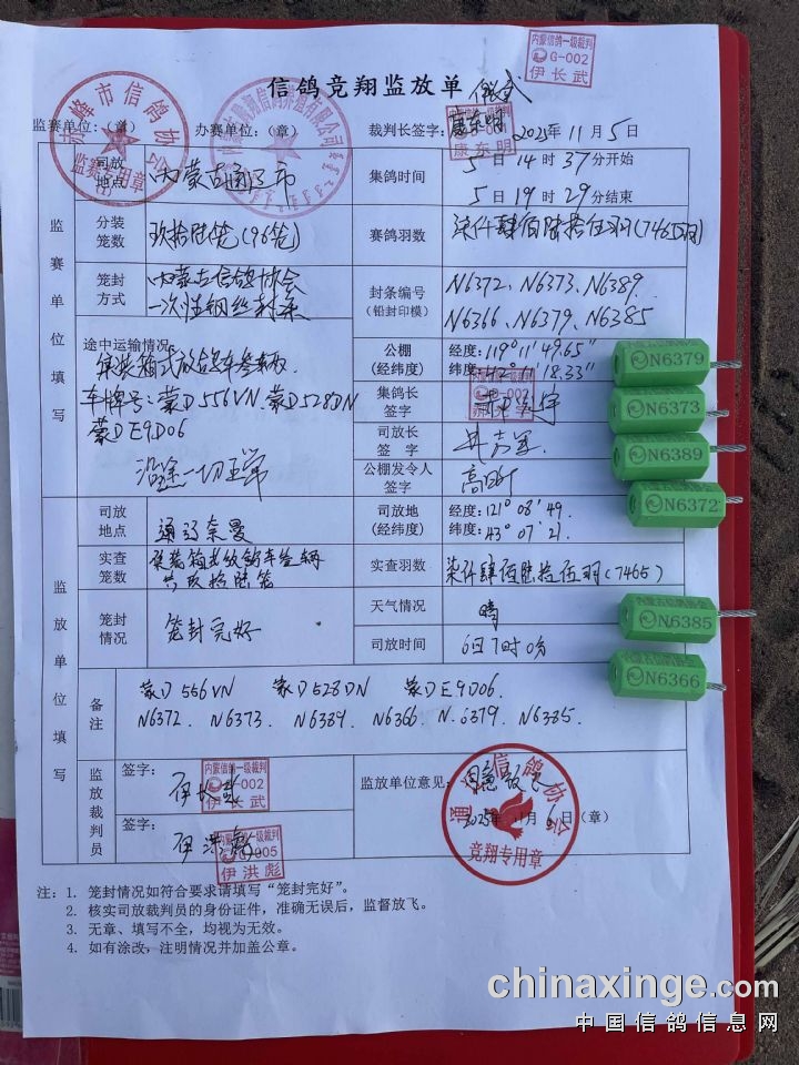 内蒙古金翔秋棚200公里热身赛更正羽色及更换电子环名单