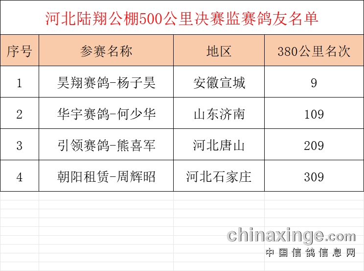 您好!公棚为真实体现落实三公原则。比赛采取裁判组、鸽友代表、信鸽千里眼三方进行监督逐羽扫描、赛鸽入笼、运输、放飞、归巢全部过程。在380公里比赛中荣获第9,109,209,309名的会员,入驻监督陆翔公棚500公里决赛全程。
