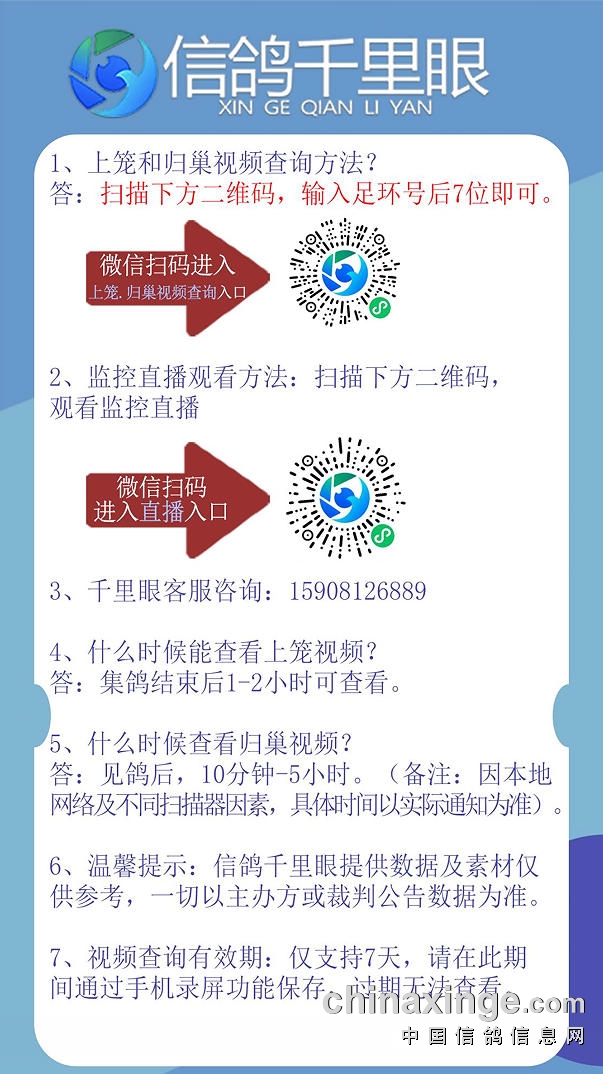 信鸽千里眼视频监控系统(简称信鸽千里眼),是一款服务信鸽赛事的可视化系统,致力于以信鸽赛事透明化服务为基础,让每一羽赛鸽得到应有的尊重,为信鸽赛事公开透明化赋能。信鸽千里眼硬件采用央企海康威视产品线标准生产,云平台基于央企萤石云开放平台开发,二者合一将音视频的直播、录制、存储、分析等能力在信鸽领域进行投入使用。