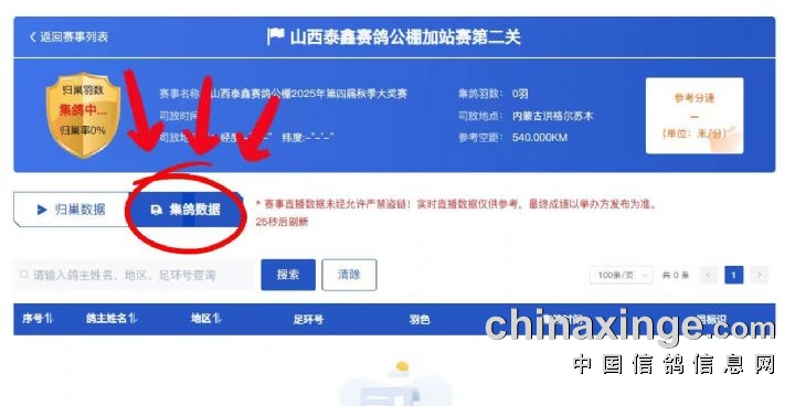 2025年第四届山西泰鑫赛鸽公棚加战赛第一关数据直播链接