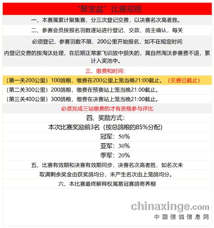 易冠赛鸽2025年“聚宝盆”活动规则(第二站交费)