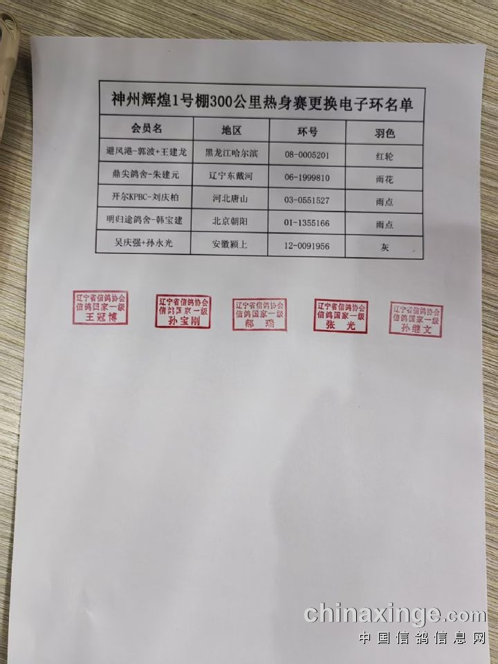 神州辉煌1号棚300公里热身赛更改羽色名单
