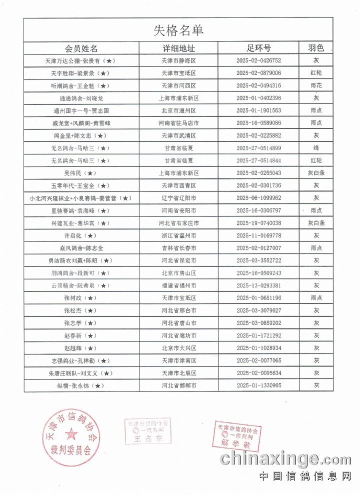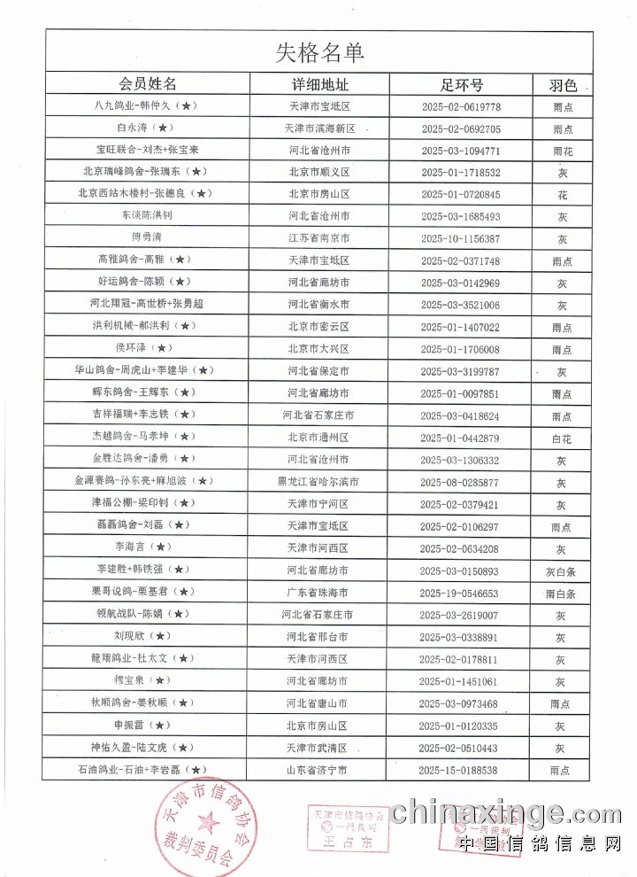 天津宇翔:380-400公里第二关失格名单