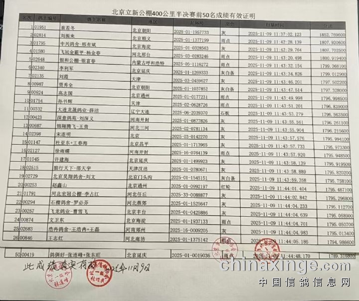 北京立新公棚400公里半决赛前50名成绩有效证明