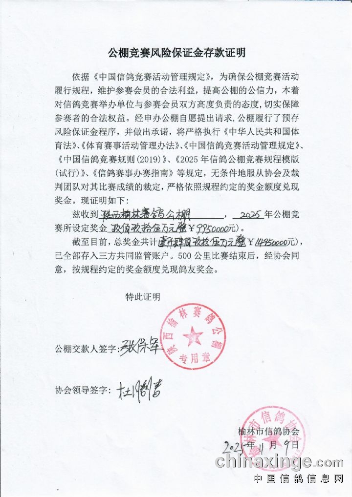 陕西榆林赛鸽公棚2025年全额奖金存入三方共管账户