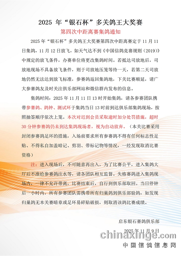 2025年"银石杯"多关鸽王大奖赛第四次中距离赛集鸽通知