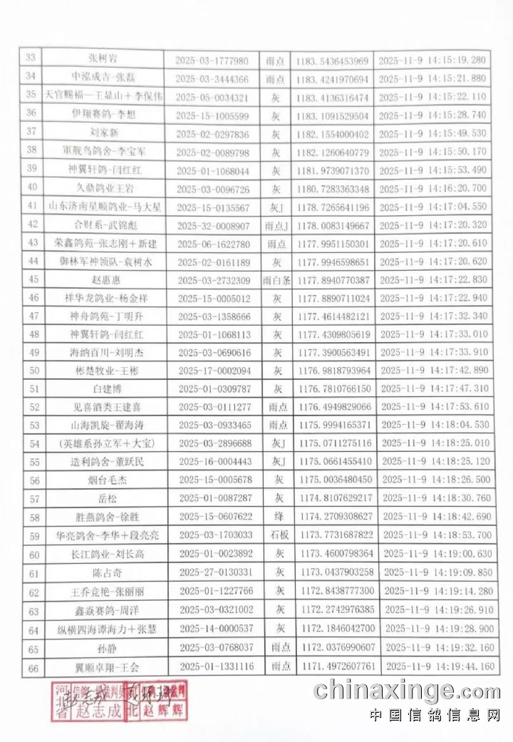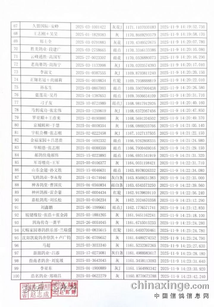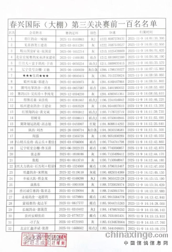 春兴国际(大棚)第三关决赛前100名获奖鸽名单