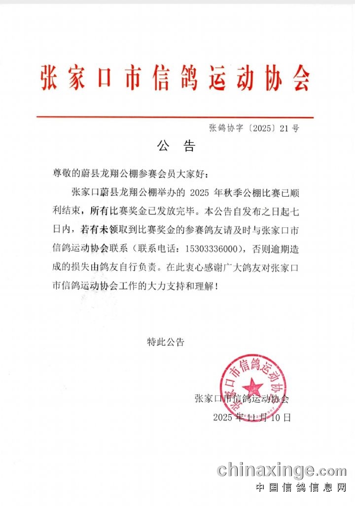 龙翔赛鸽公棚2025年赛事奖金发放完毕公告