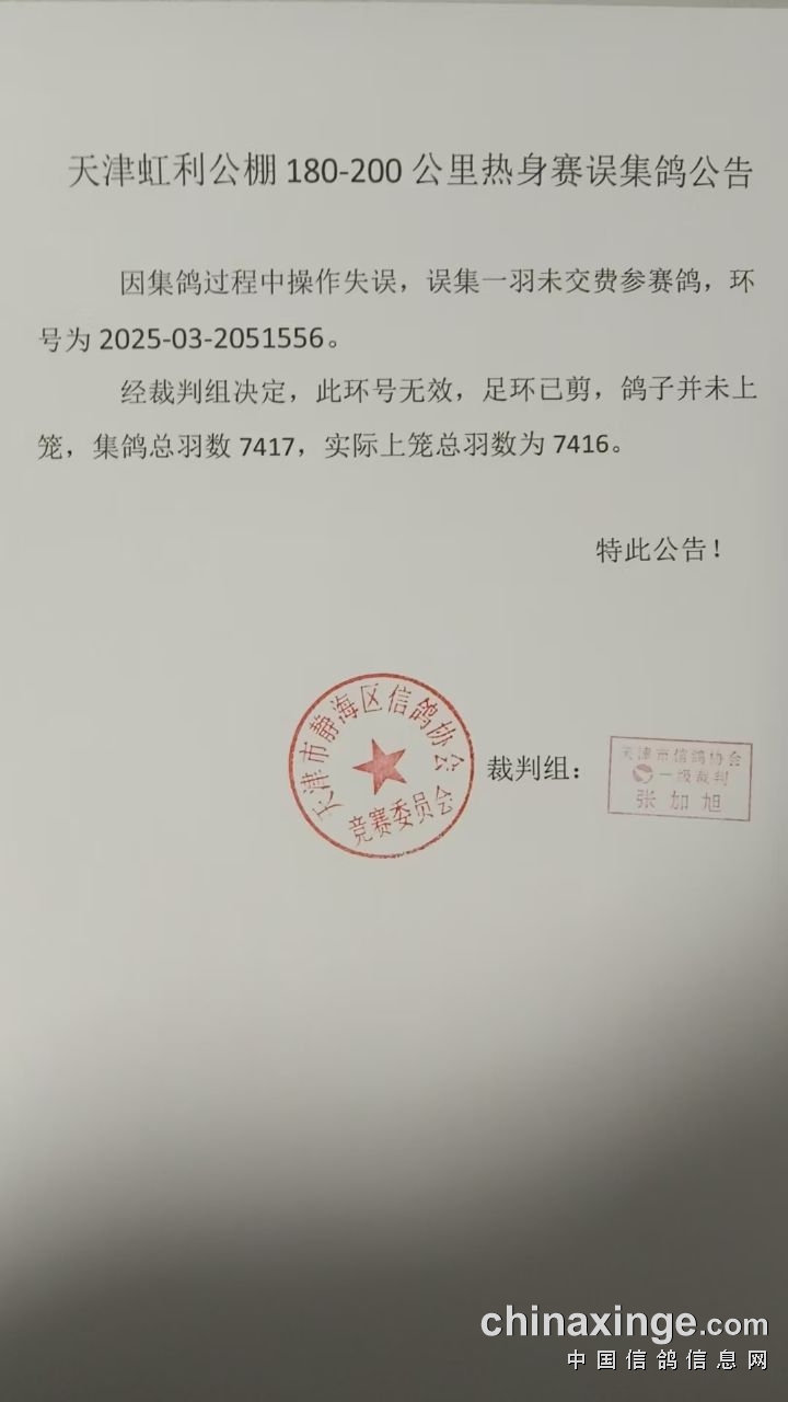 天津虹利公棚180-200公里热身赛误集鸽公告