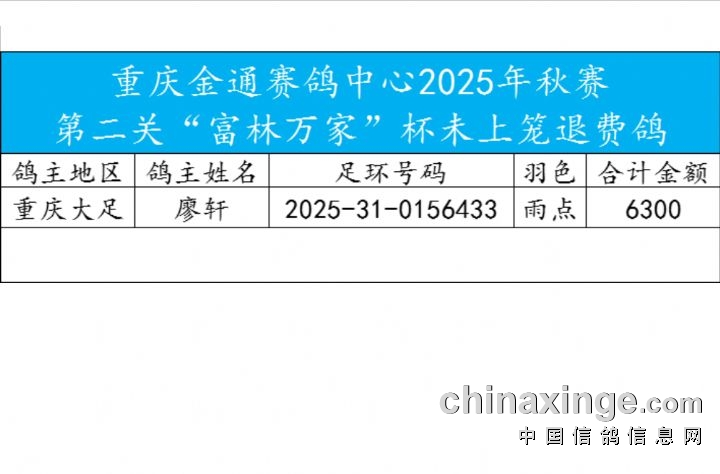 • 重庆金通2025年秋赛不拍卖鸽领回登记通知 (2025-11-28 12:43:07)