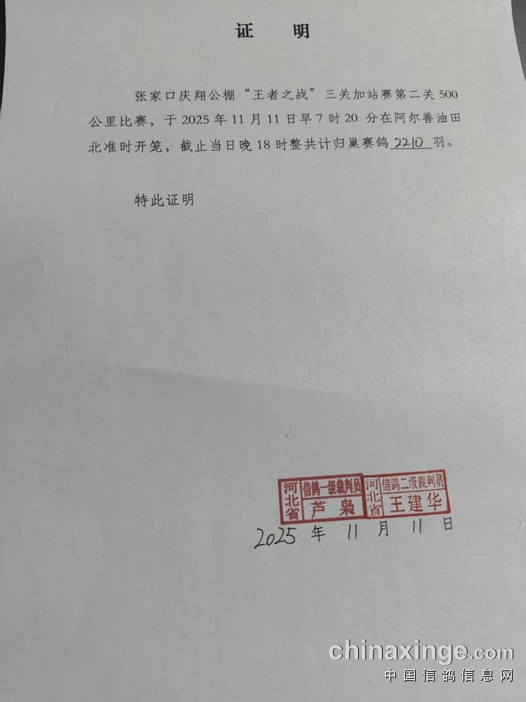 张家口庆翔公棚加站赛第二关当日归巢证明