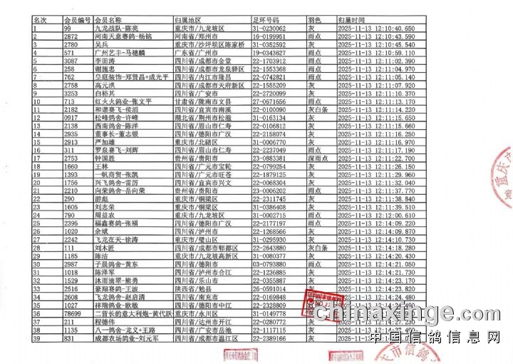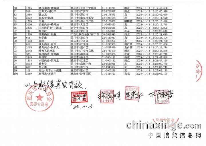 重庆翔标公棚2025年秋赛预赛前一百名清单