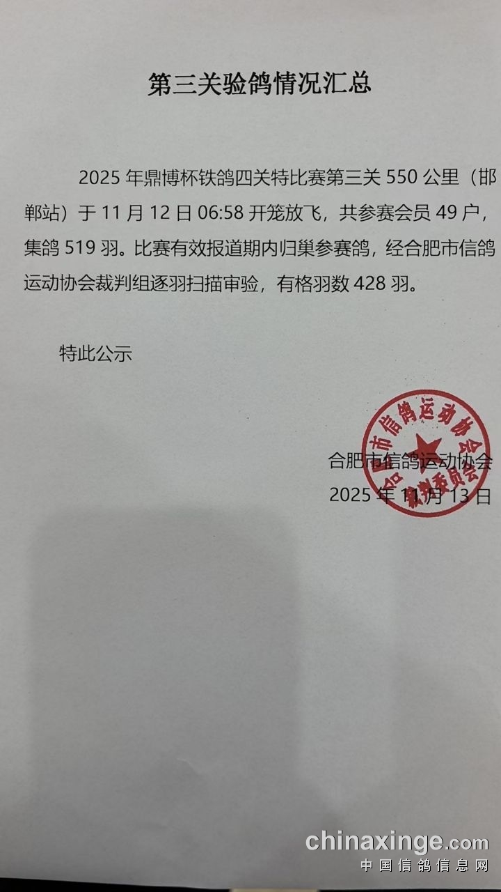 2025年鼎博杯"铁鸽四关"特比赛第三关550公里(邯郸站)开笼公告