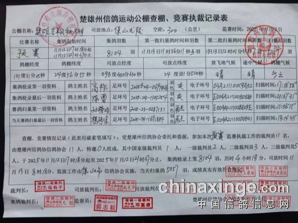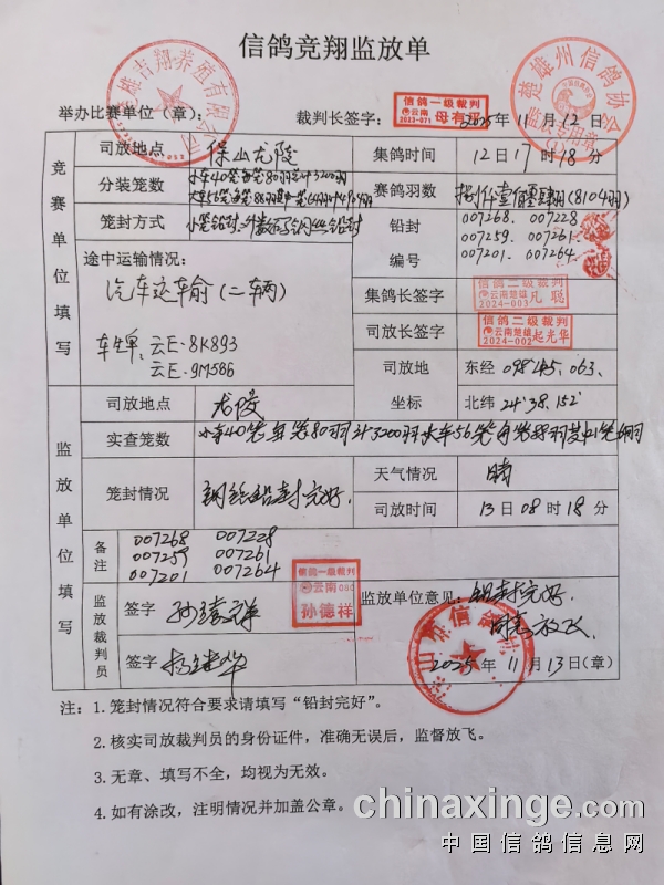 楚雄吉翔秋棚300公里预赛执裁记录表、监放单