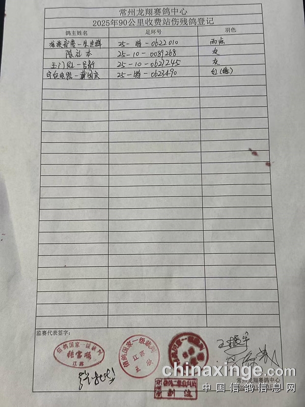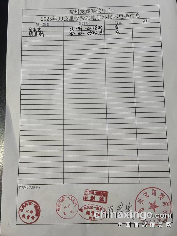常州龙翔:2025年90公里收费站伤残鸽及电子环更换清单