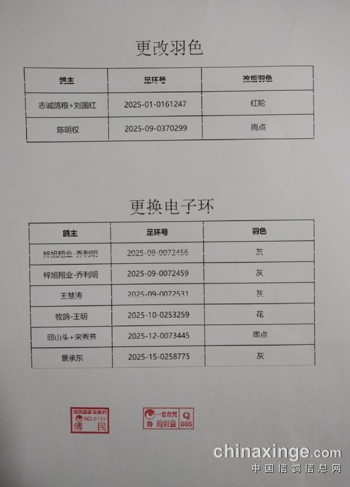 山东舜峰赛鸽公棚收费站更改羽色及电子环清单