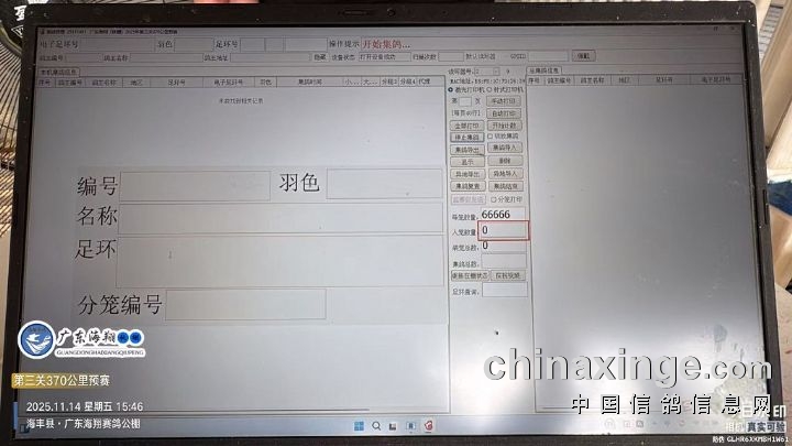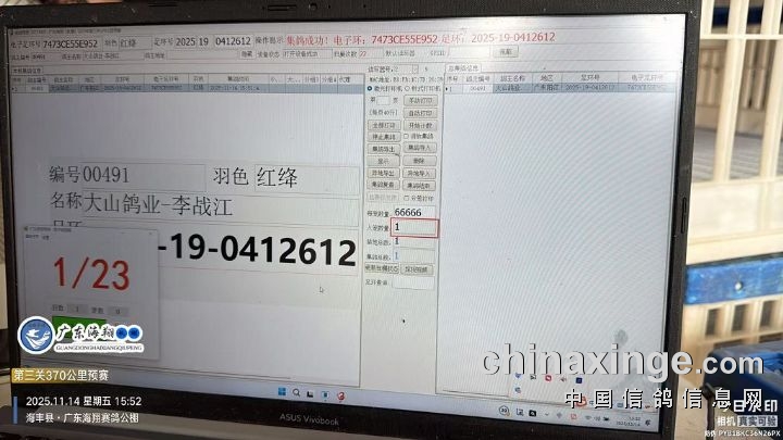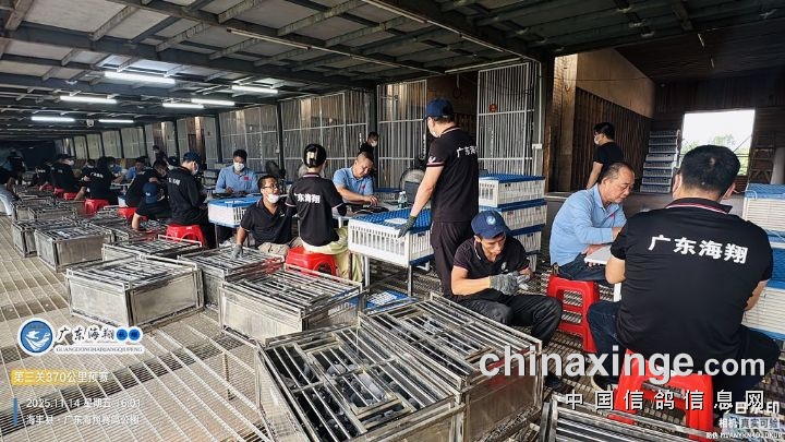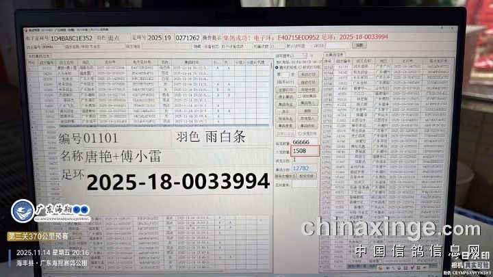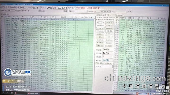 2025年广东海翔(秋棚)第九届第三关预赛,由广东省鸽协委派裁判长及汕尾市裁判组进行逐羽扫描、核对环号、盖章等工作;共集鸽12782羽。