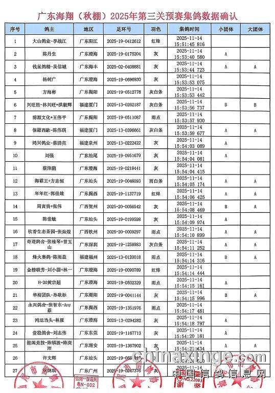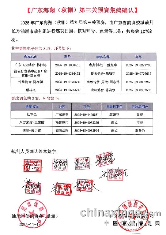 | 【广东海翔(秋棚)第三关预赛集鸽确认】