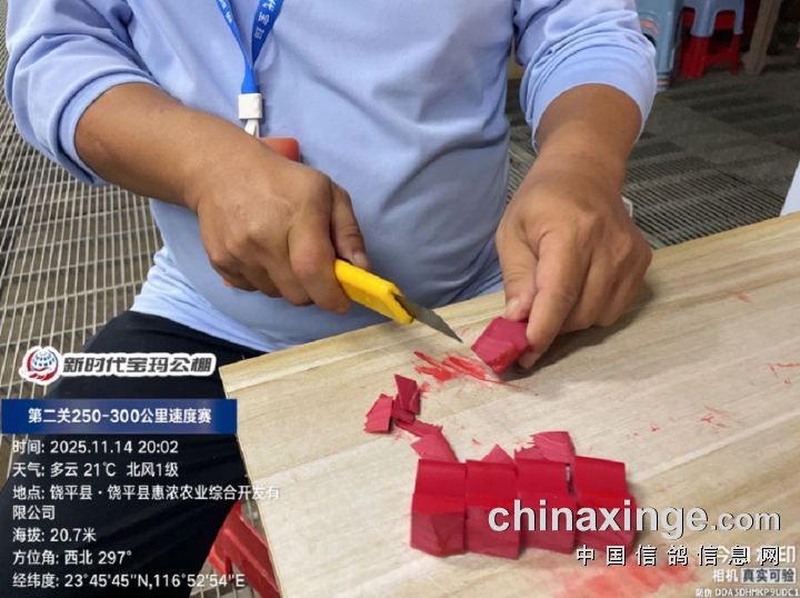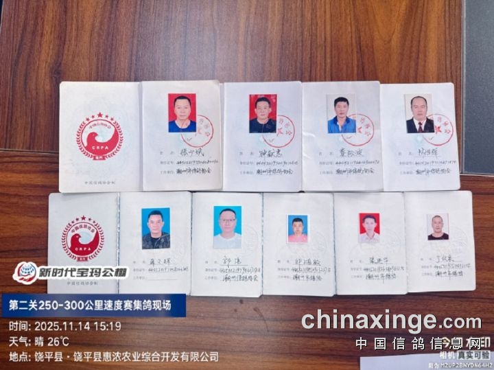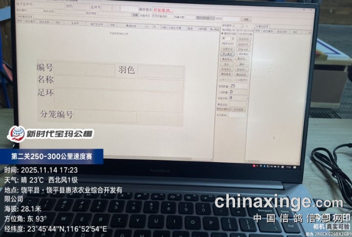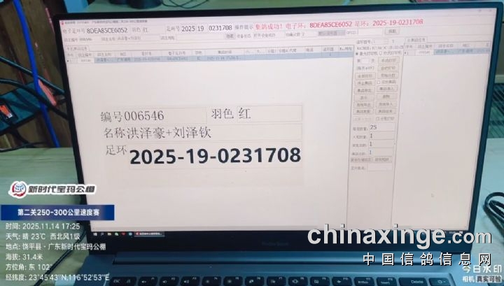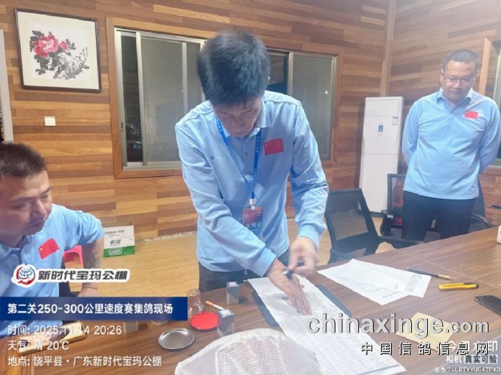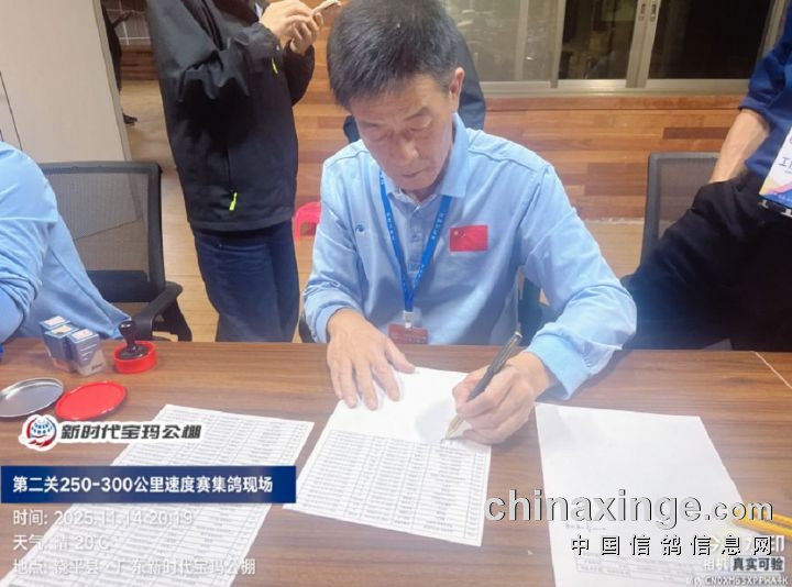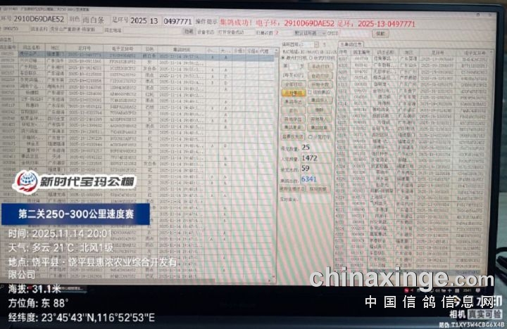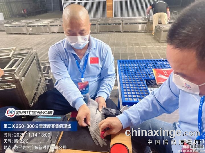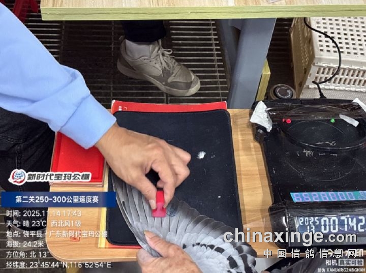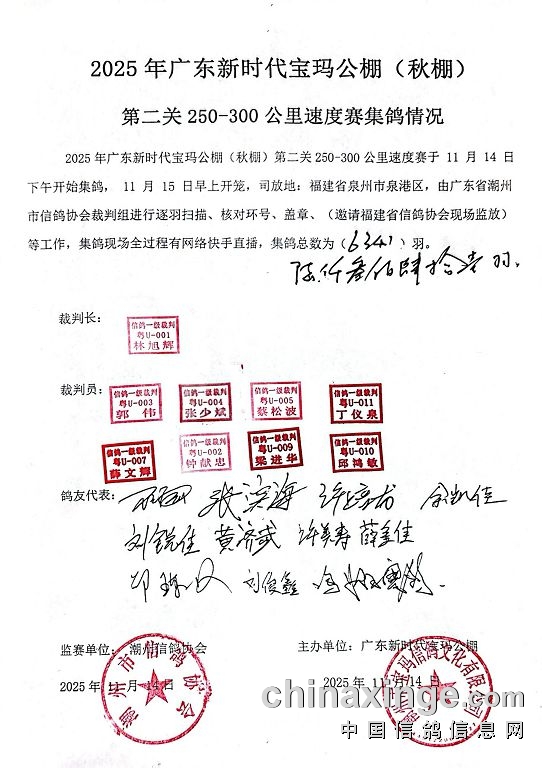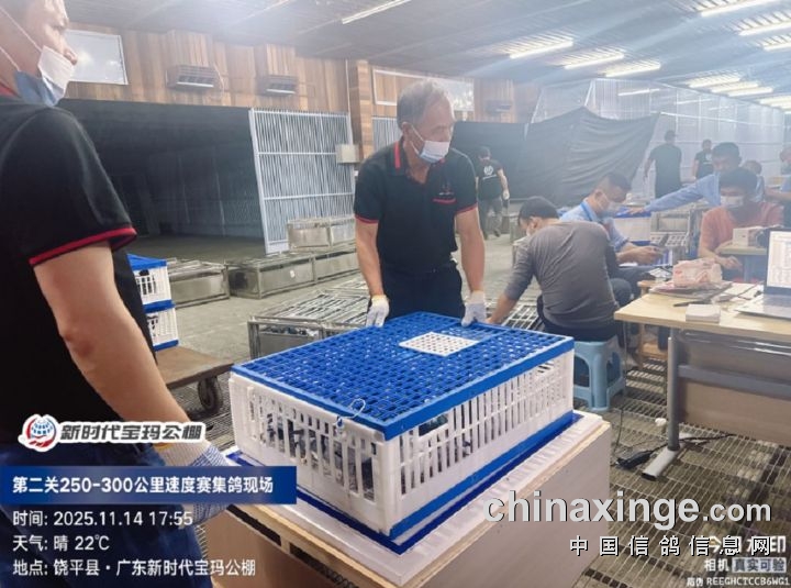 2025年广东新时代宝玛(秋棚)第二关250-300公里速度赛,由广东省潮州市信鸽协会裁判组进行逐羽扫描、核对环号、盖章等工作;共集鸽6341羽。