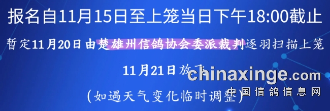 1、本次赛事报名仅限已参加楚雄吉翔公棚2025年第五届(秋棚)的鸽主报名。报名赛鸽非本人名下赛鸽报名无效!禁止第三方报名!