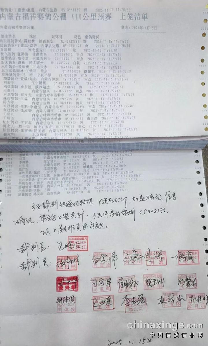 内蒙古福祥赛鸽公棚500公里决赛集鸽清单