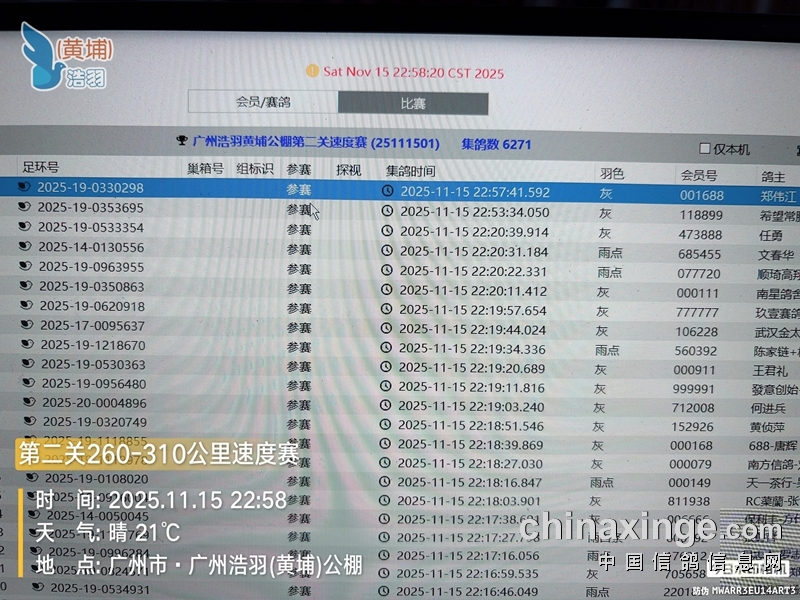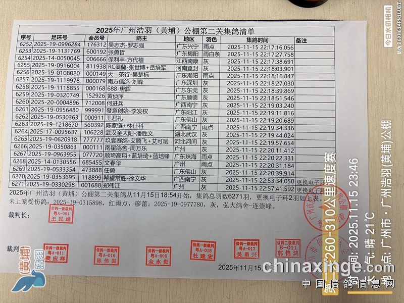 • 广州浩羽(黄埔)公棚第二关3日归巢有效名单(开笼起至第三天19:00为有效报到期) (2025-11-18 19:35:56)