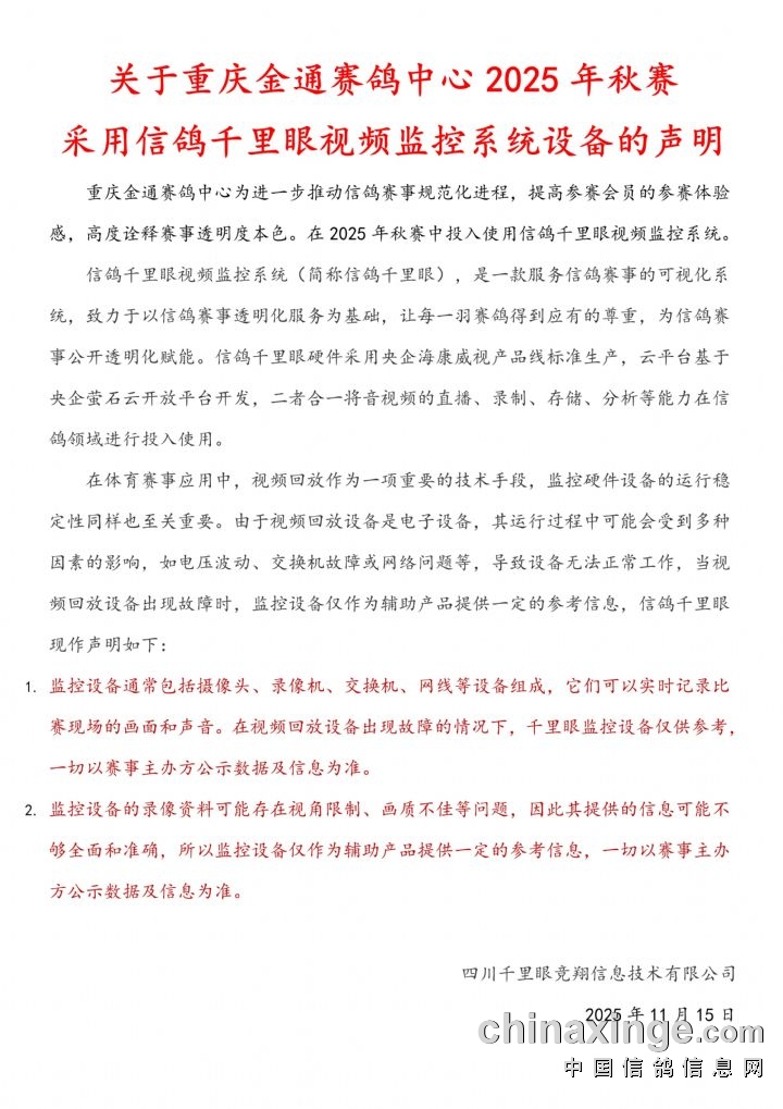 重庆金通2025年秋赛采用信鸽千里眼视频监控系统设备声明