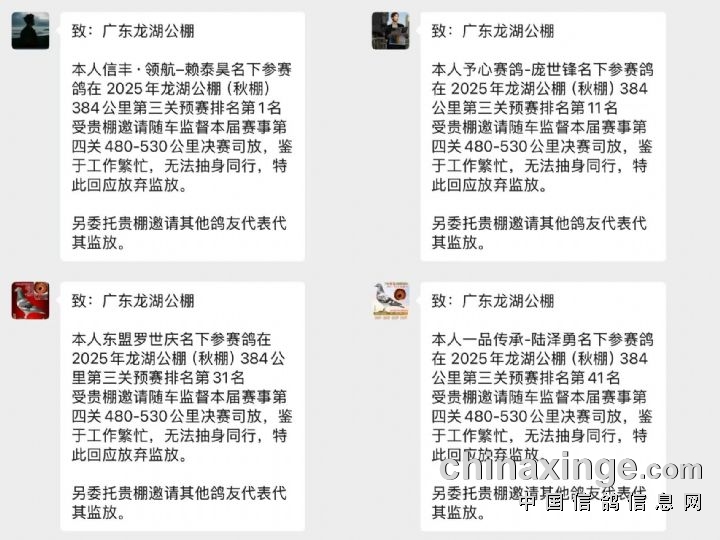 第1名11名31名41名的鸽友由于个人原因无法参与本次决赛的监放!