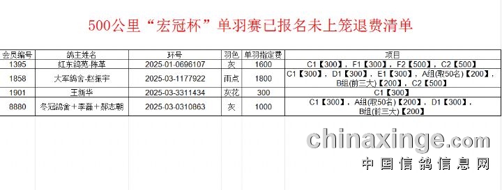 河北宏冠500公里“宏冠杯”单羽赛已报名未上笼退费清单