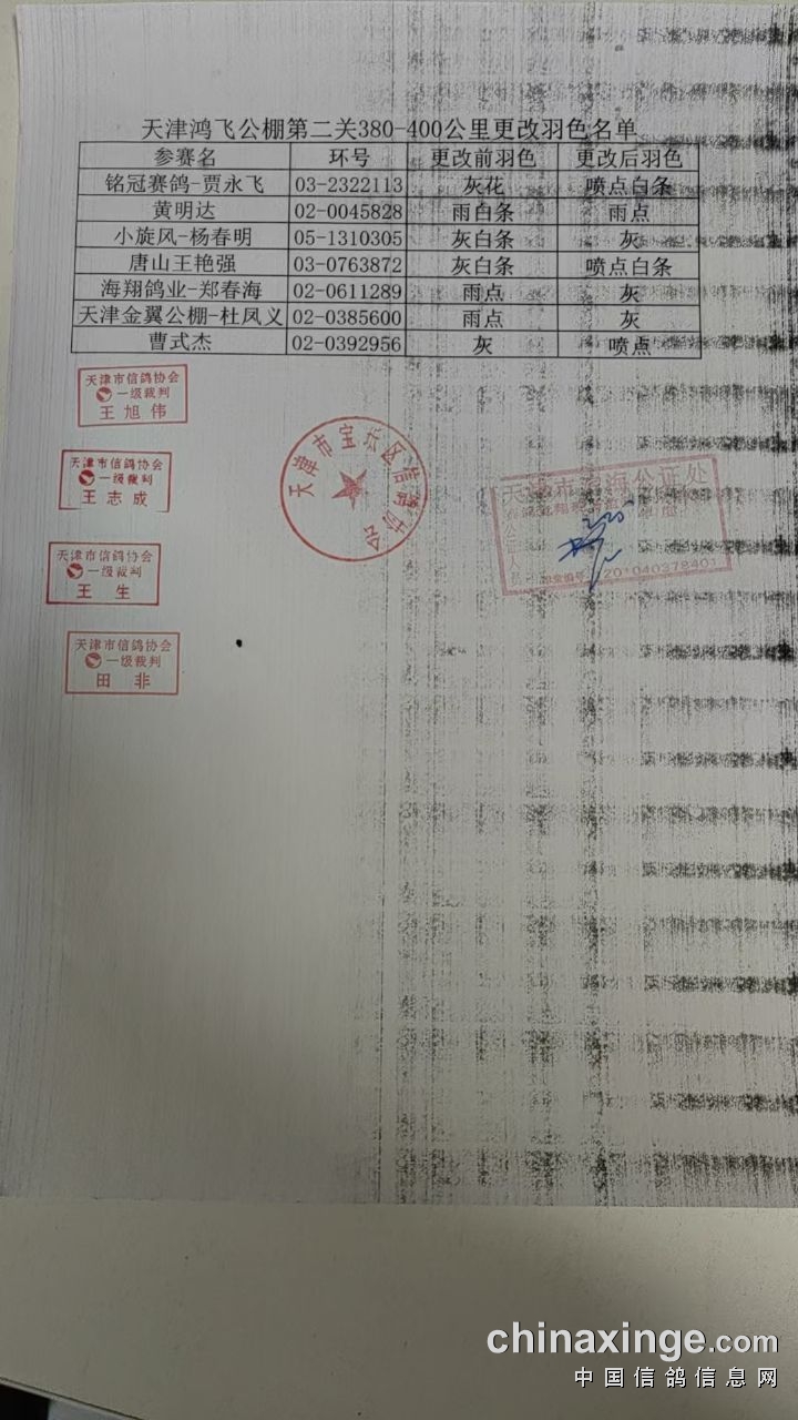天津鸿飞公棚第二关380-400更改羽色名单