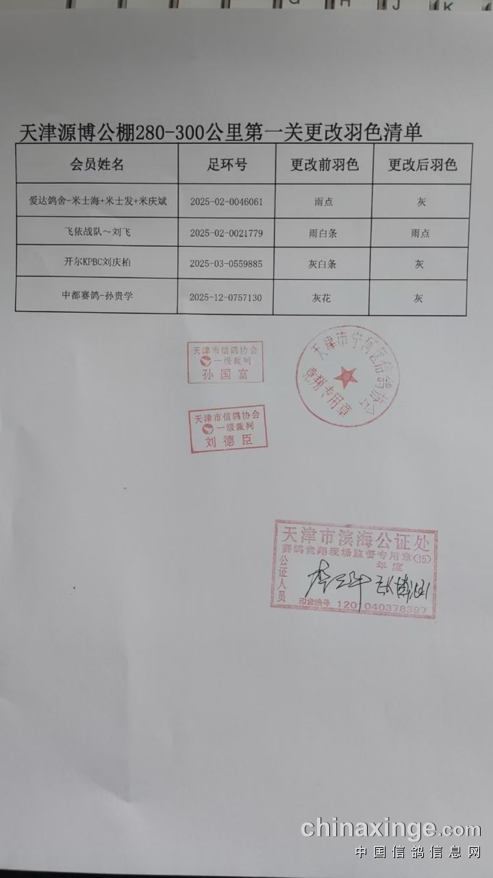 天津源博公棚280-300公里第一关更改羽色清单