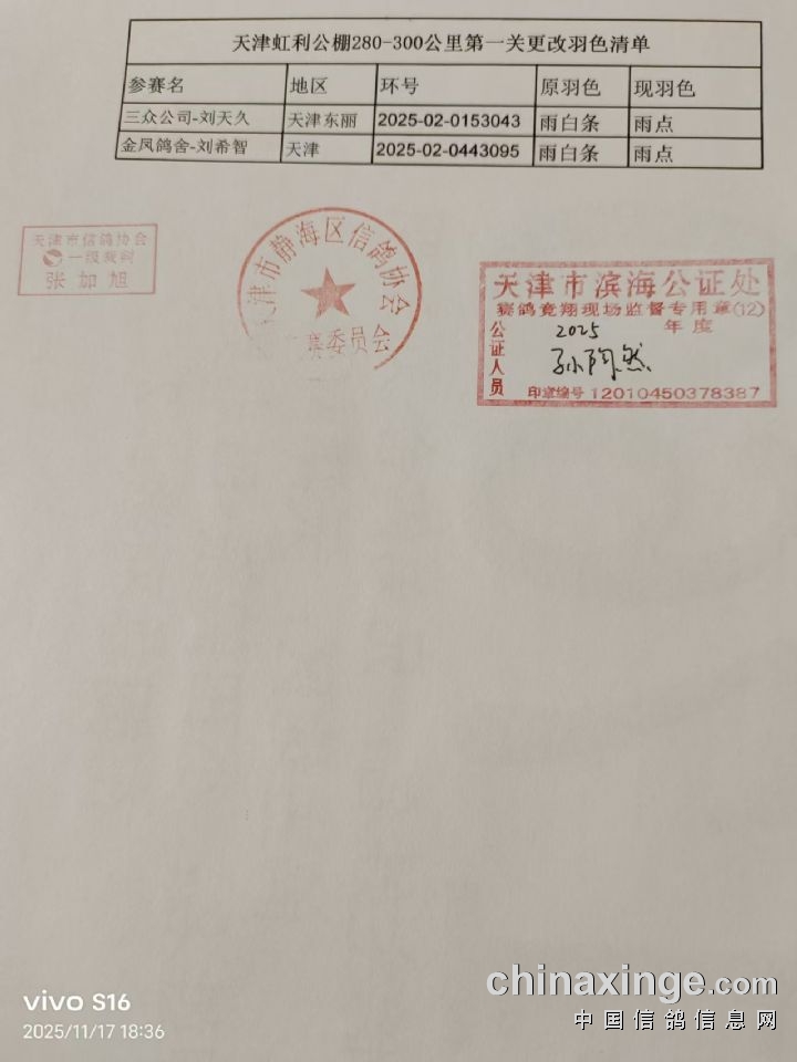 虹利公棚280-300公里更改羽色清单