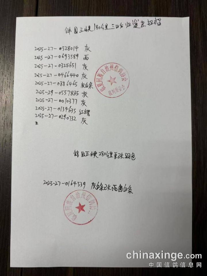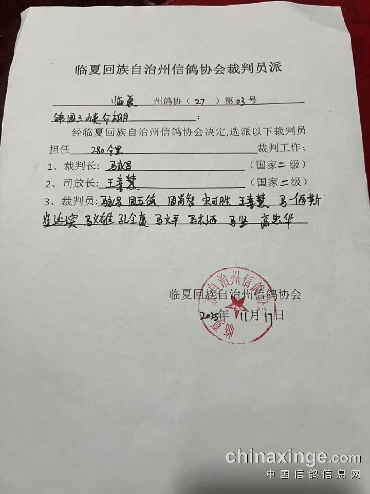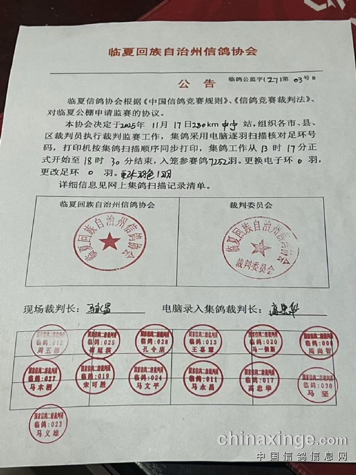 甘肃锦园三峡赛鸽公棚280公里预赛临夏州信鸽协会监放证明单