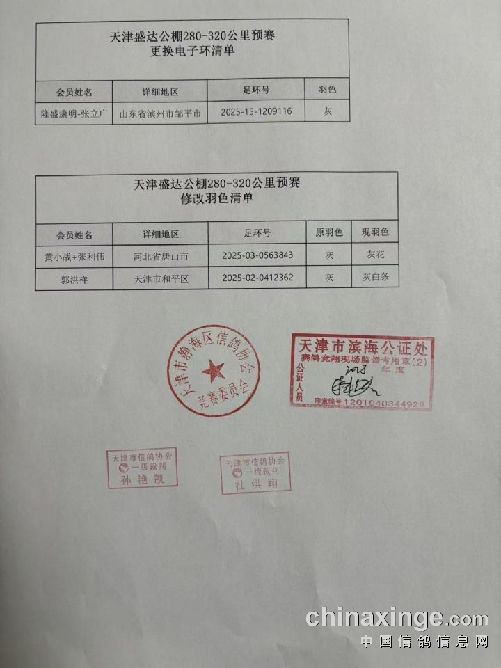天津盛达公棚280-320公里预赛更改清单(羽色、更换电子环)