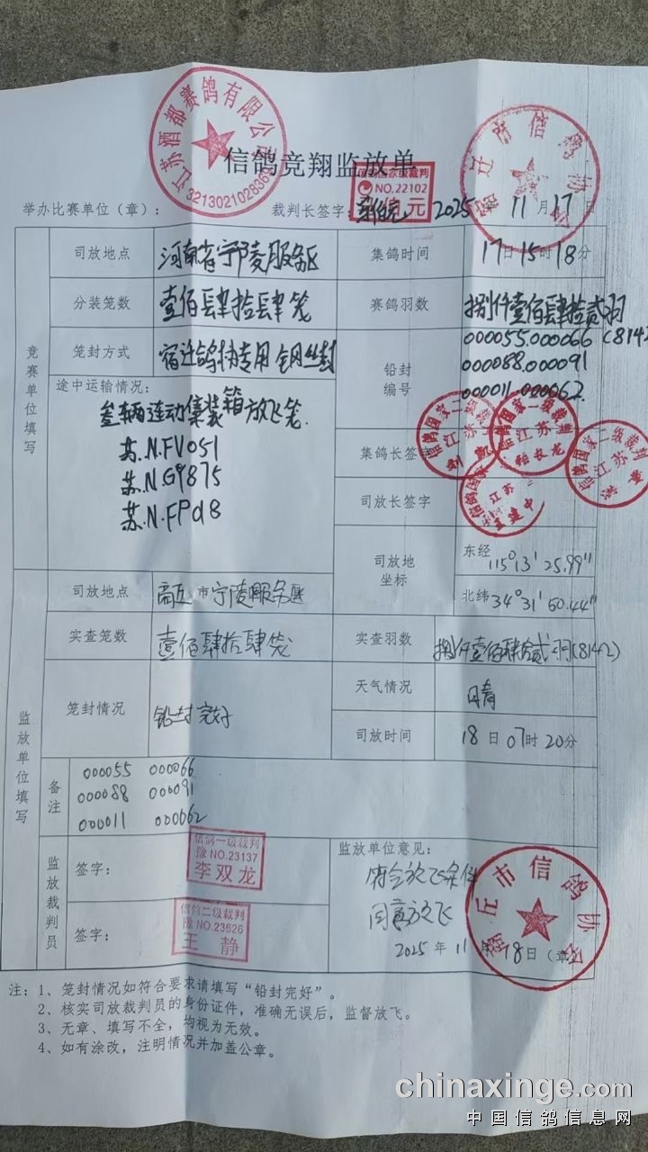 江苏酒都赛鸽公棚第一关关赛获奖名单