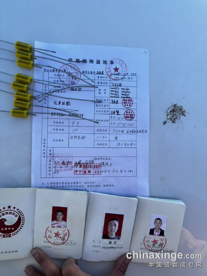 甘肃锦园三峡赛鸽公棚280公里预赛临夏州信鸽协会监放证明单