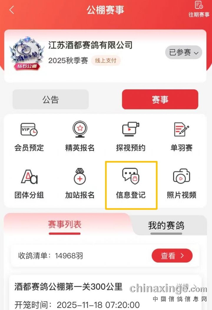 江苏酒都赛鸽公棚300公里第一关各项成绩已生成,公棚将于11月18日下午开始陆续发放奖金,获奖会员请将到(D"P"S)首页搜索酒都公棚→信息登记→身份证照片以及银行卡号、户名、开户行(注:参赛名和银行卡名字必须一致)进行登记。按照登记信息逐一转账,请大家相互转告,请您不要催促,感谢您的配合!