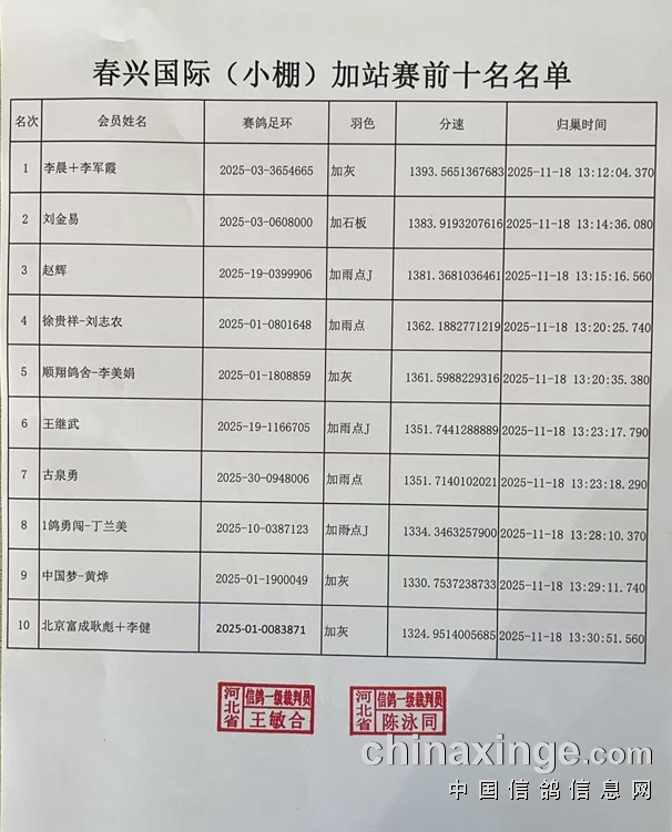 春兴国际(小棚)加站赛开笼信息及数据直播链接