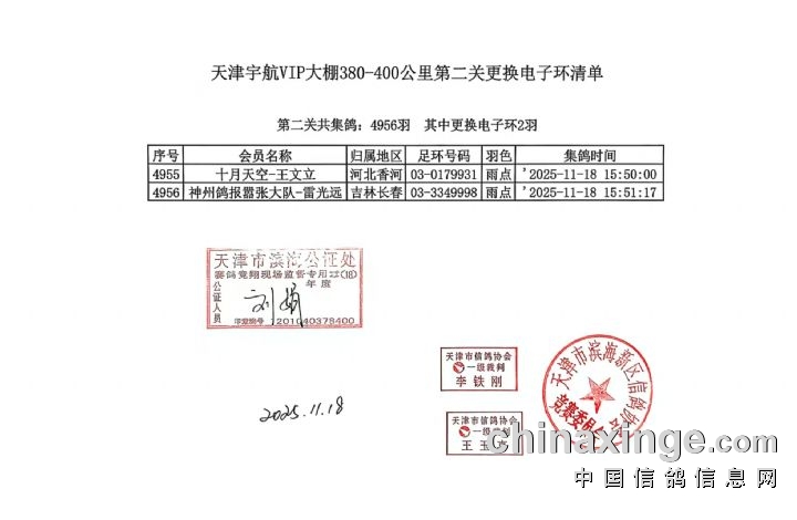天津宇航VIP大棚403公里第二关当日归巢数据
