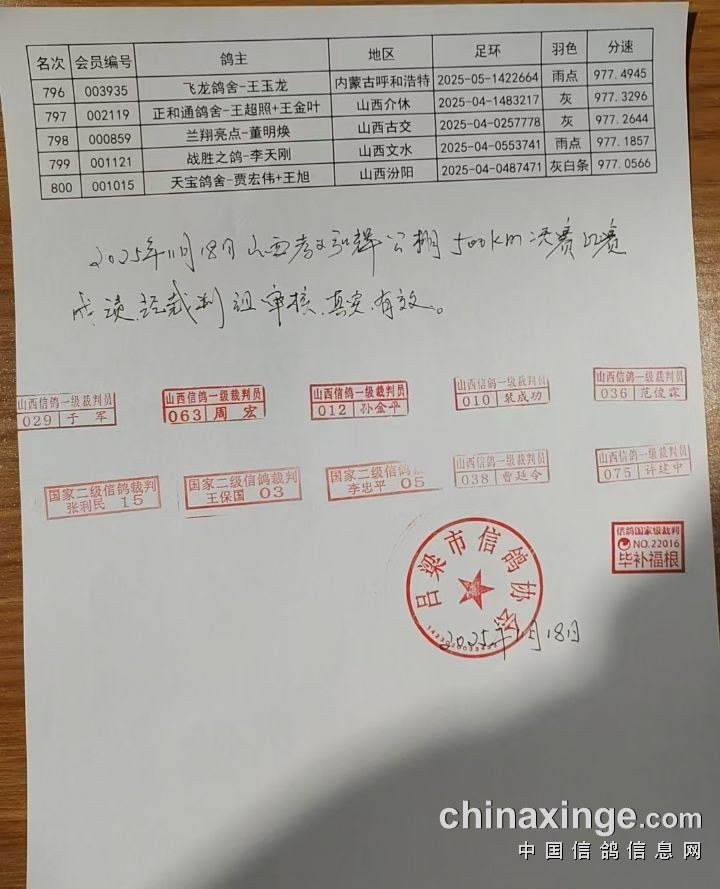 决赛前800名,经山西省信鸽协会,吕梁市信鸽协会,执行裁判逐羽验