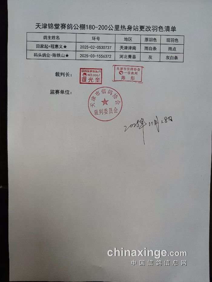天津锦堂公棚180-200公里热身赛更改羽色清单